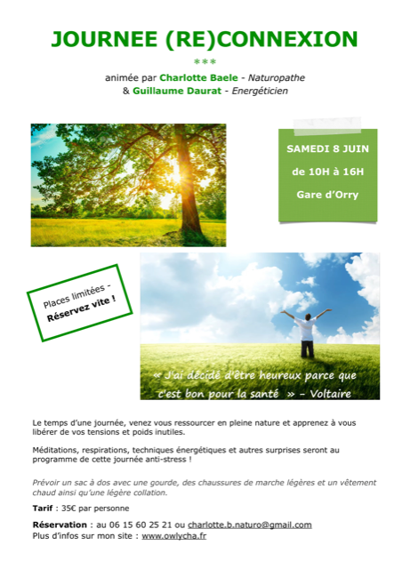Je suis heureux de vous annoncer qu’une journée bien-être s’annonce. En compagnie de Charlotte BAËLE, naturopathe (www.owlycha.fr), nous proposerons des ateliers ludiques pour nous (re)connecter à la Terre, ainsi que pour nous (re)connecter à notre nature profonde.
